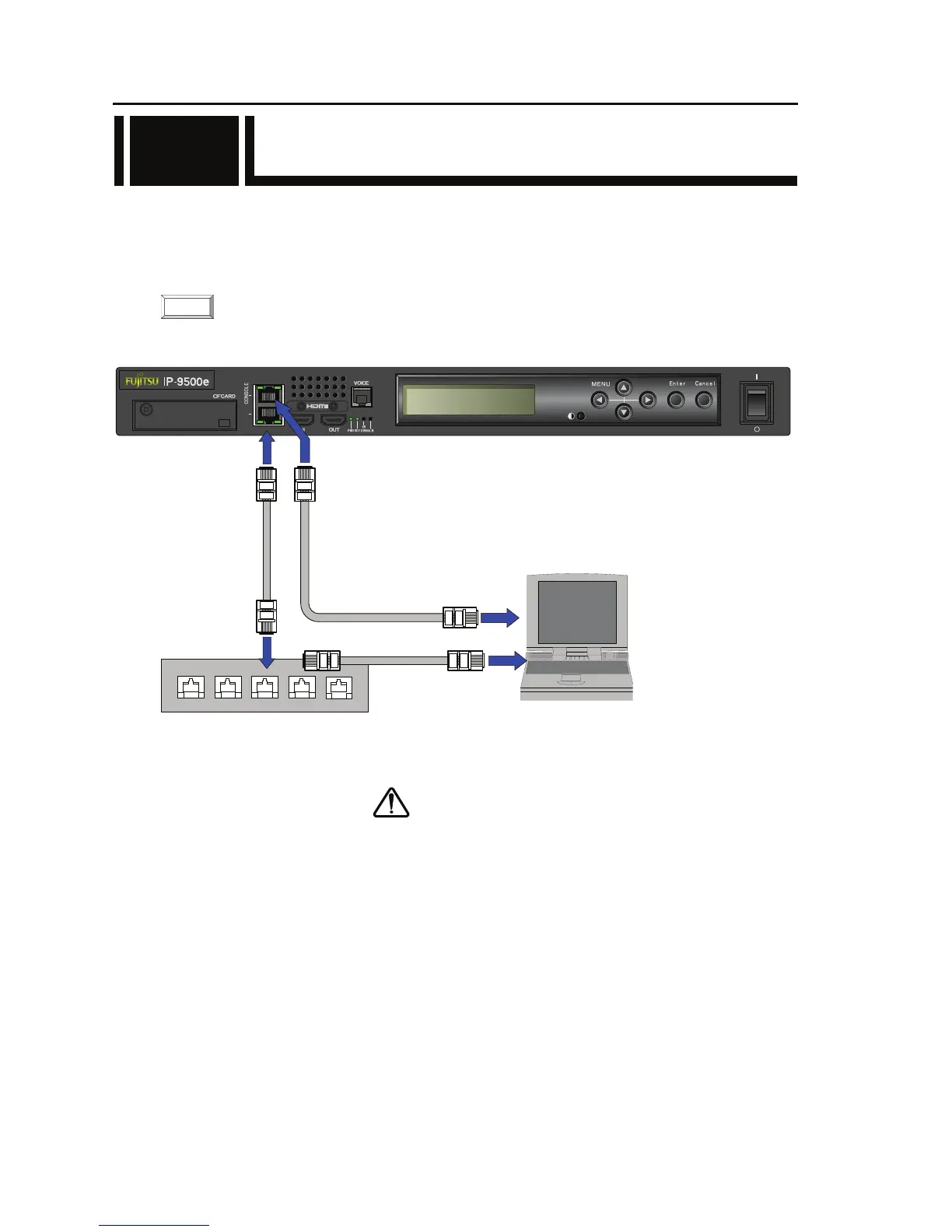 [CONSOLE/LAN] of IP-9500e using a LAN cable (UTP cable). The LAN communication port