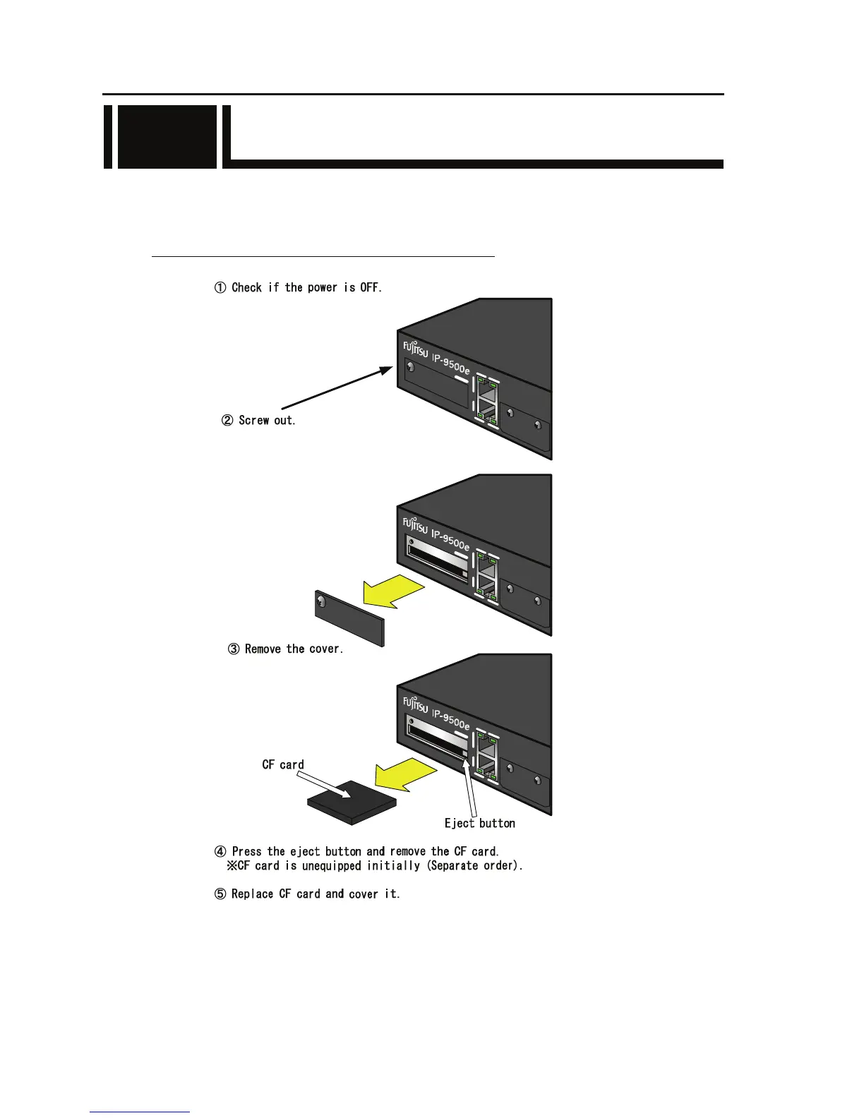 In order to insert the CF card, the front cover of IP-9500e must be opened by screwing out the cover.
