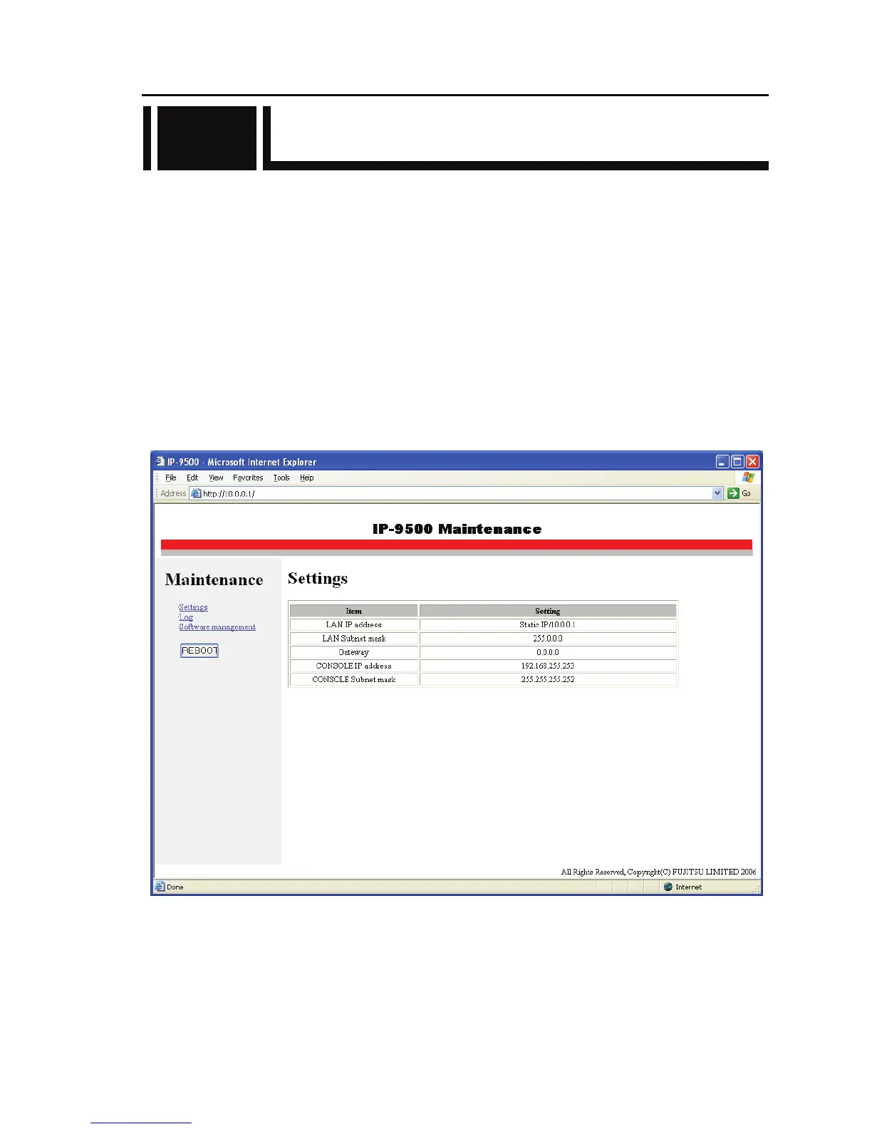 On the PC Web browser, specify the IP address of IP-9500e (LAN: 10.0.0.1, CONSOLE: