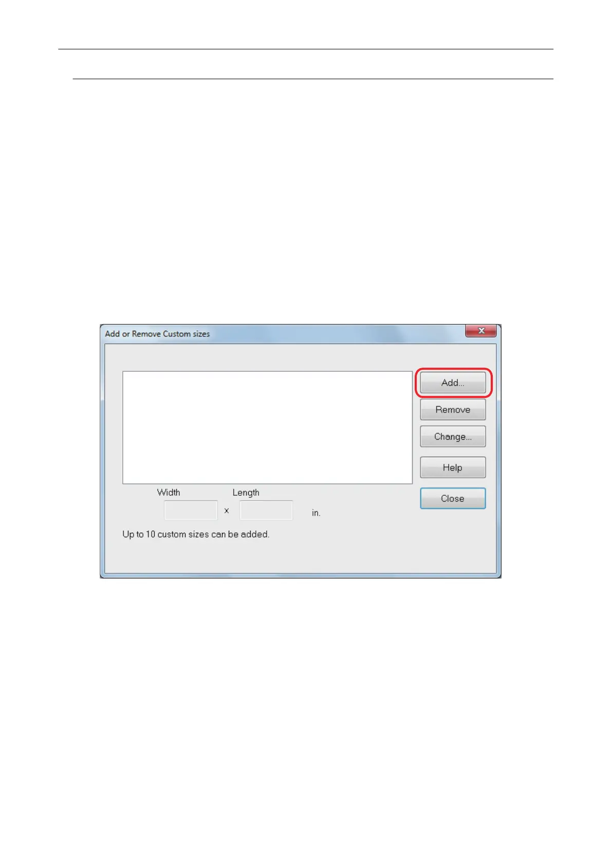 a The [Add or Remove Custom sizes] window appears.