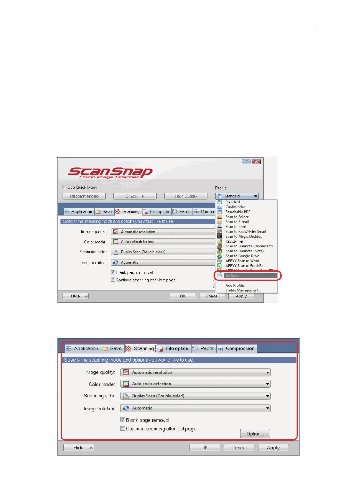 For details about each tab, refer to the ScanSnap Manager Help.