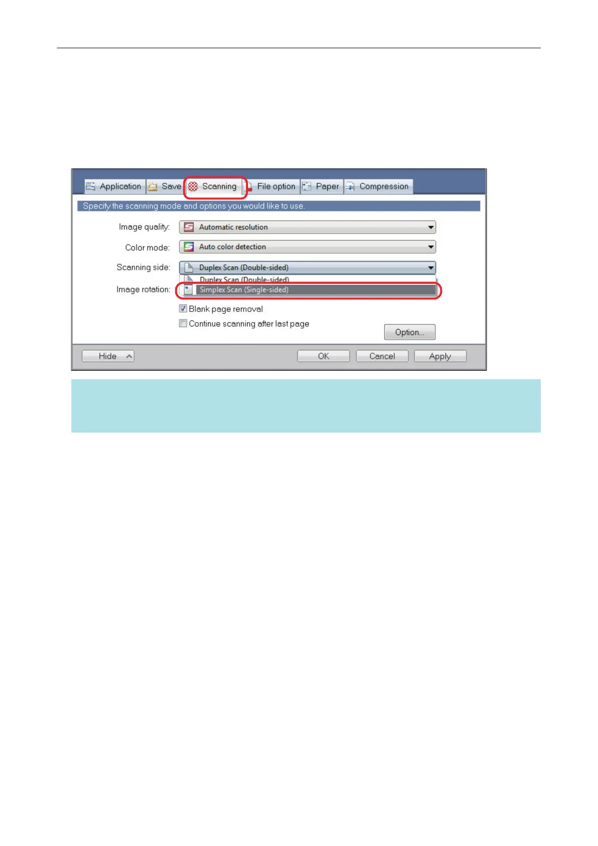 To scan only one side of a document, in the [Scanning] tab of the ScanSnap setup window, select