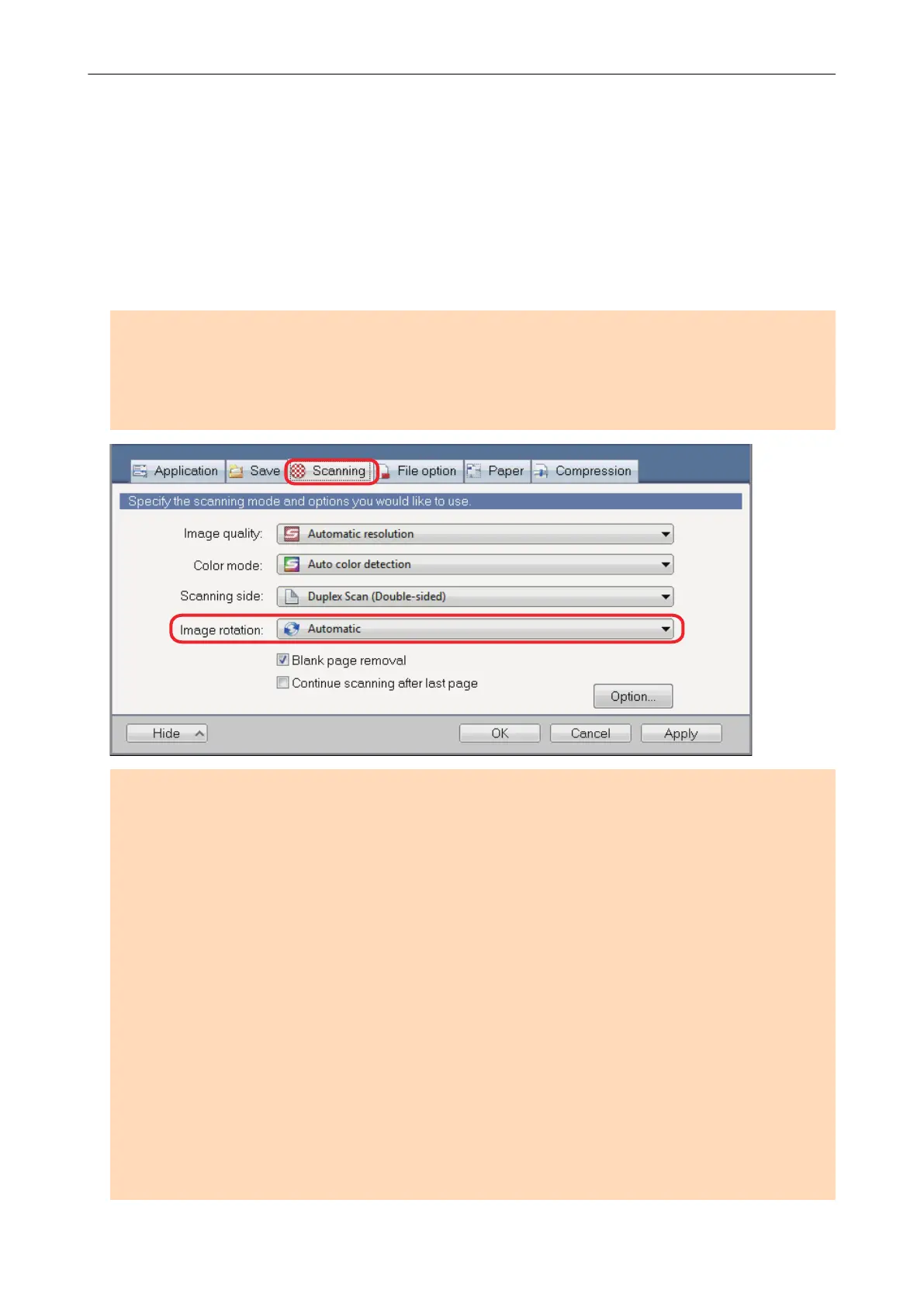 To rotate the orientation of scanned images, select [Image rotation] in the [Scanning] tab of the