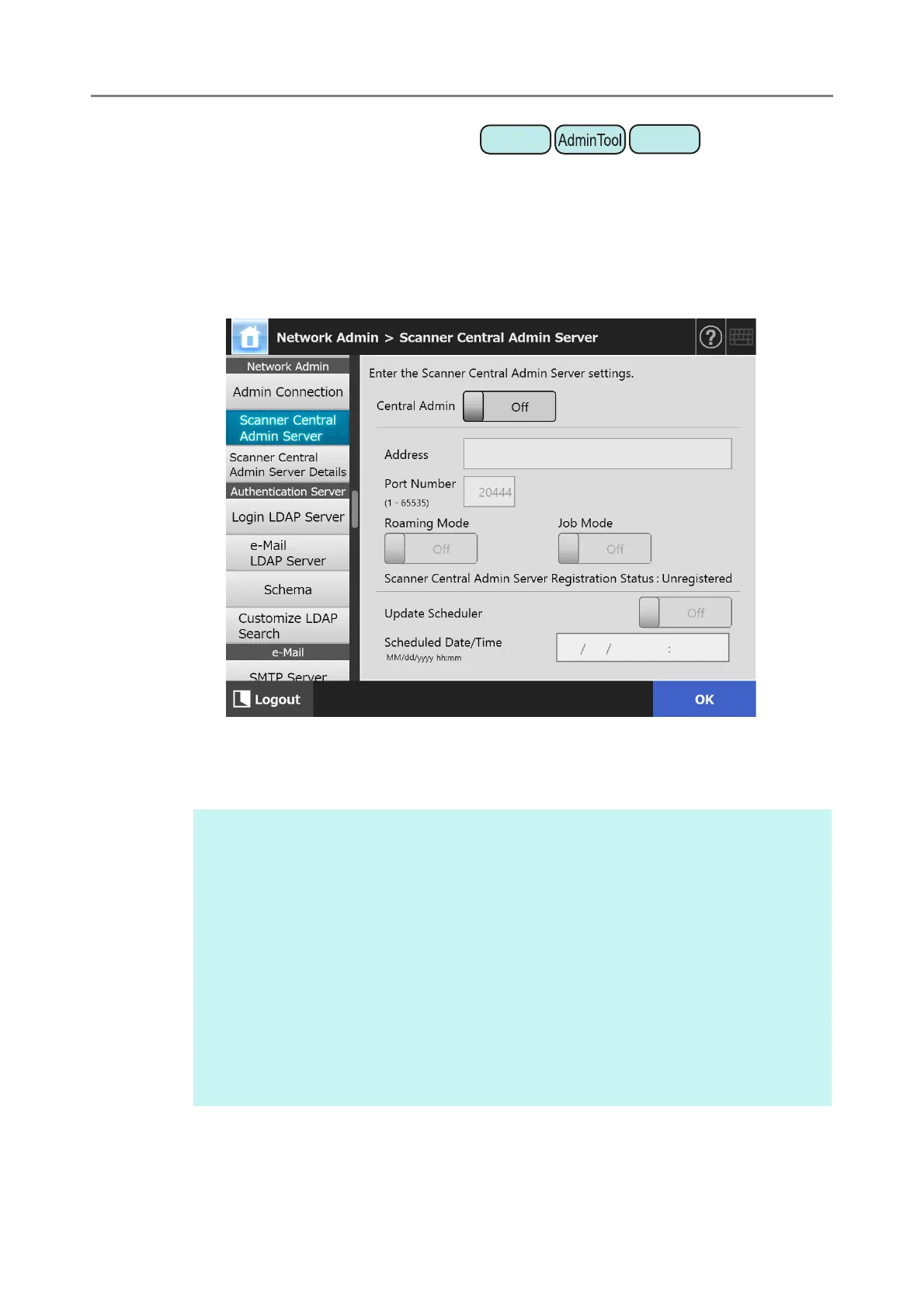 Central Admin Server and scanner, refer to "4.9.1 Setting the Admin Connection" (page