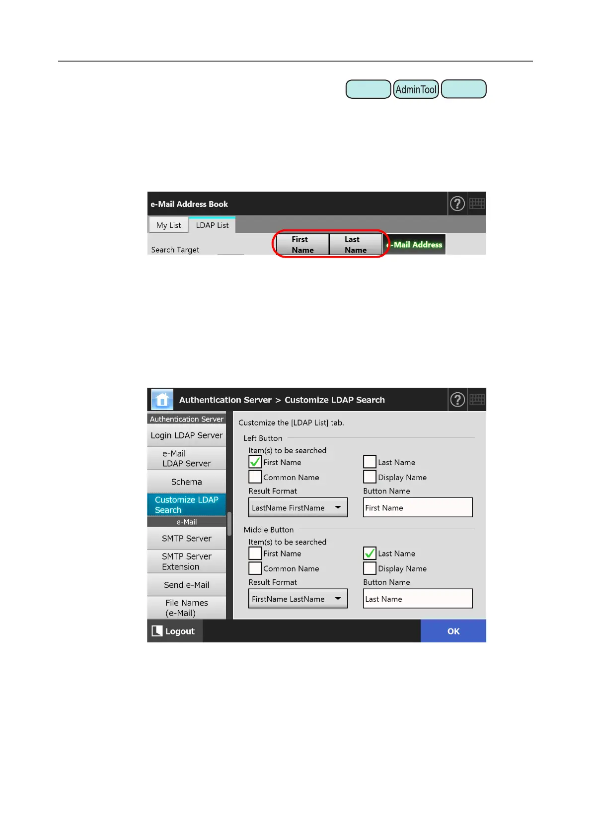 LDAP search parameters are search conditions specified for the (left and middle) buttons