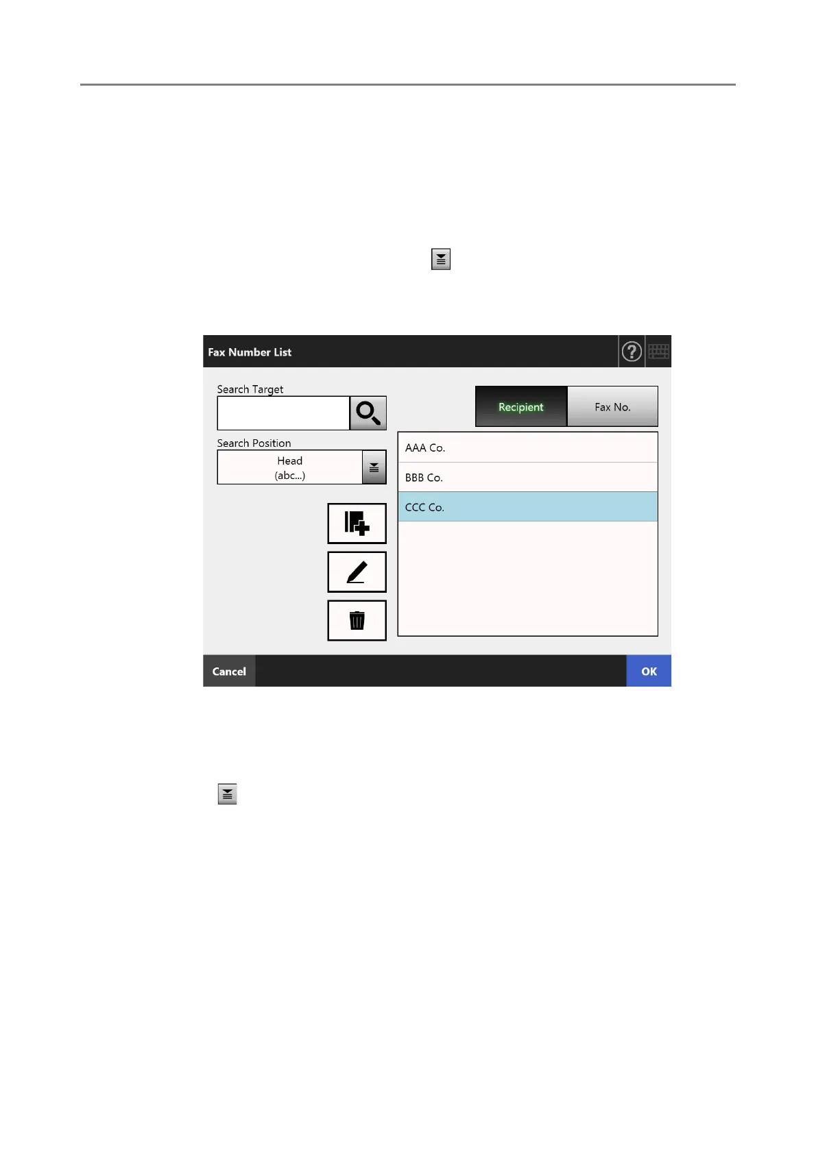 1. On the [Send Fax] window, press on the right side of the recipient fax