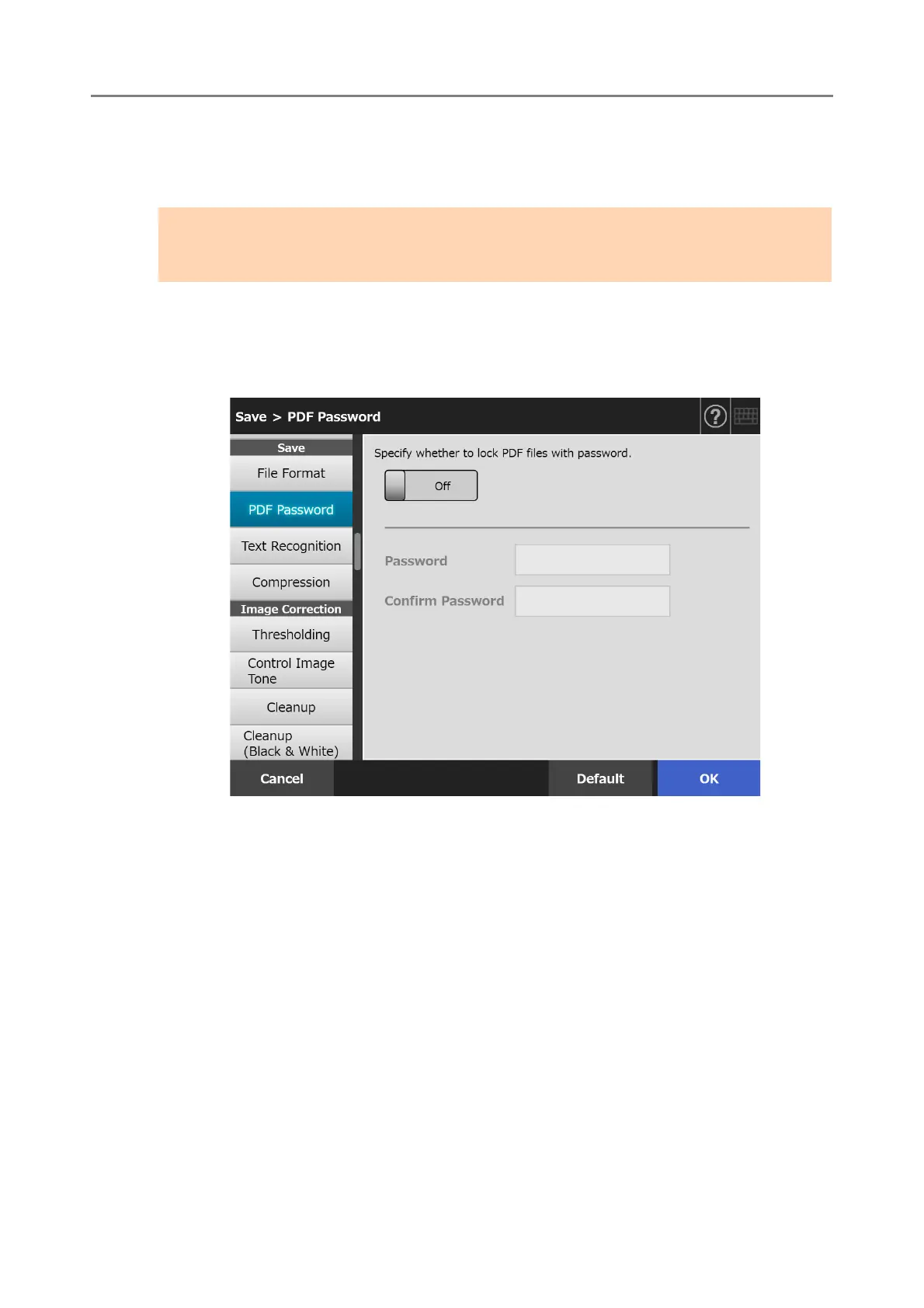 When the file format is [PDF], PDF files can be locked with a user-specified password.