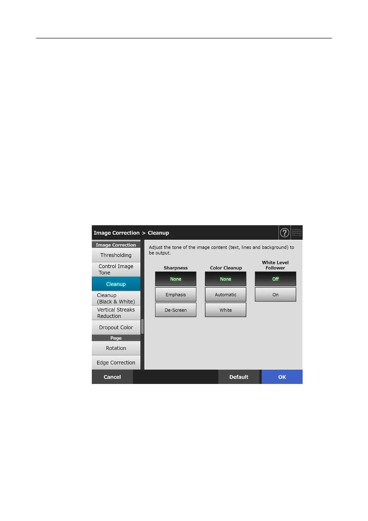 1. Select [Cleanup] under [Image Correction] on the scan settings window.