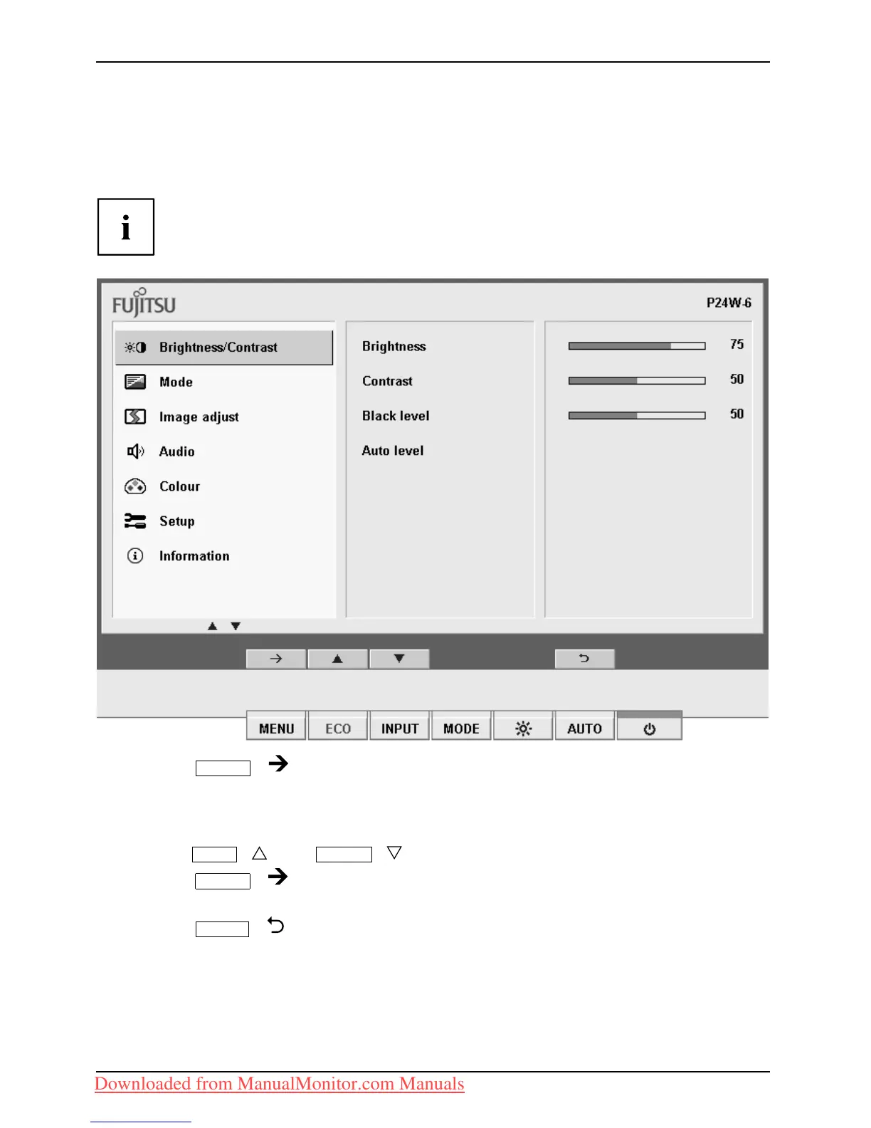 The first symbol, (Brightness/Contrast), is highlighted and the associated functions