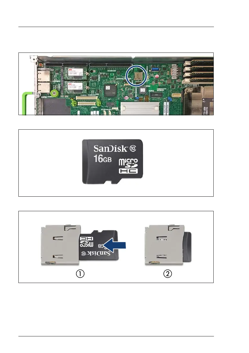 Ê With the label facing up, insert the iRMC microSD card into the microSD