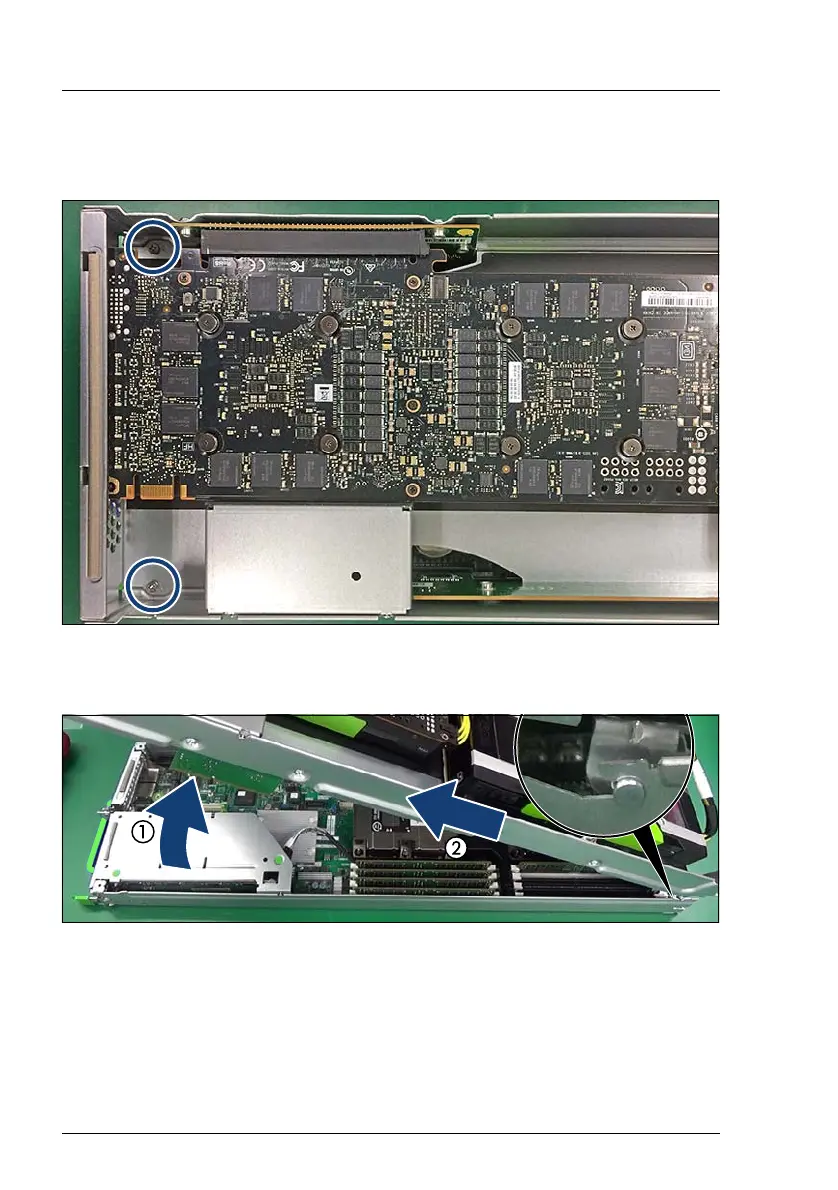 – Swivel the GPGPU extension tray up (1) and remove it from the system