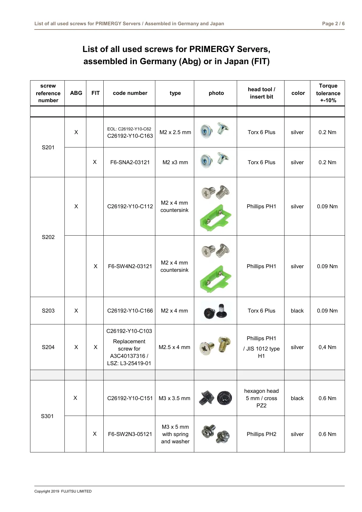 List of all used screws for PRIMERGY Servers / Assembled in Germany and Japan Page 2 / 6