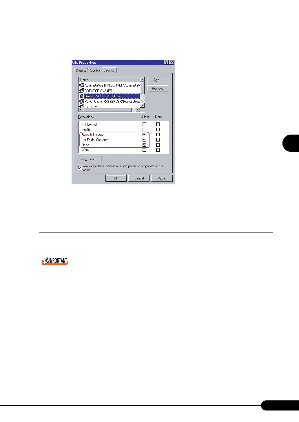 3 Click the [Security] tab, add the Guest account, and set the "Read & Execute",