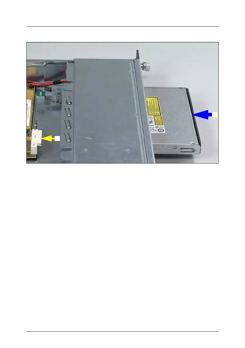 Ê From the outside, slide the CD/DVD drive into the bay (1) until it engages in