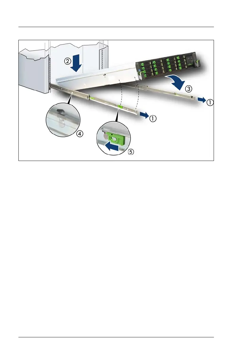 Ê At a slight angle, lower the server onto the rear mounting point on the rack