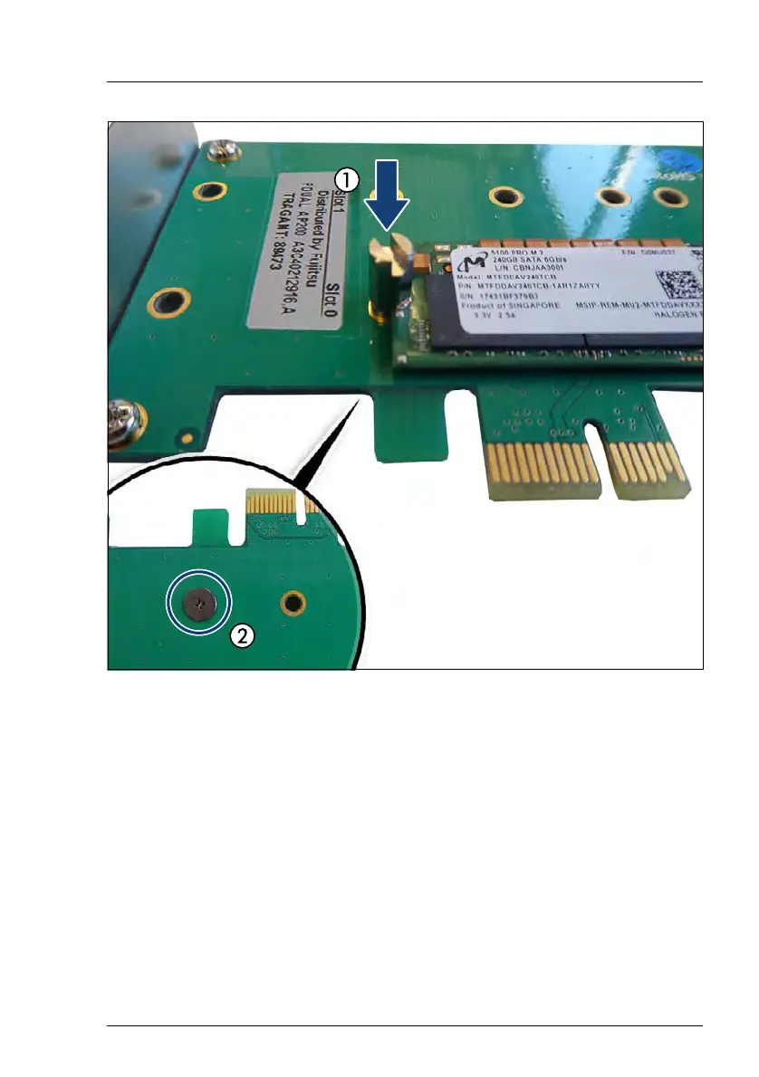 Ê Fasten the M.2 SSD with the screw (see circle) at the bottom side (2).