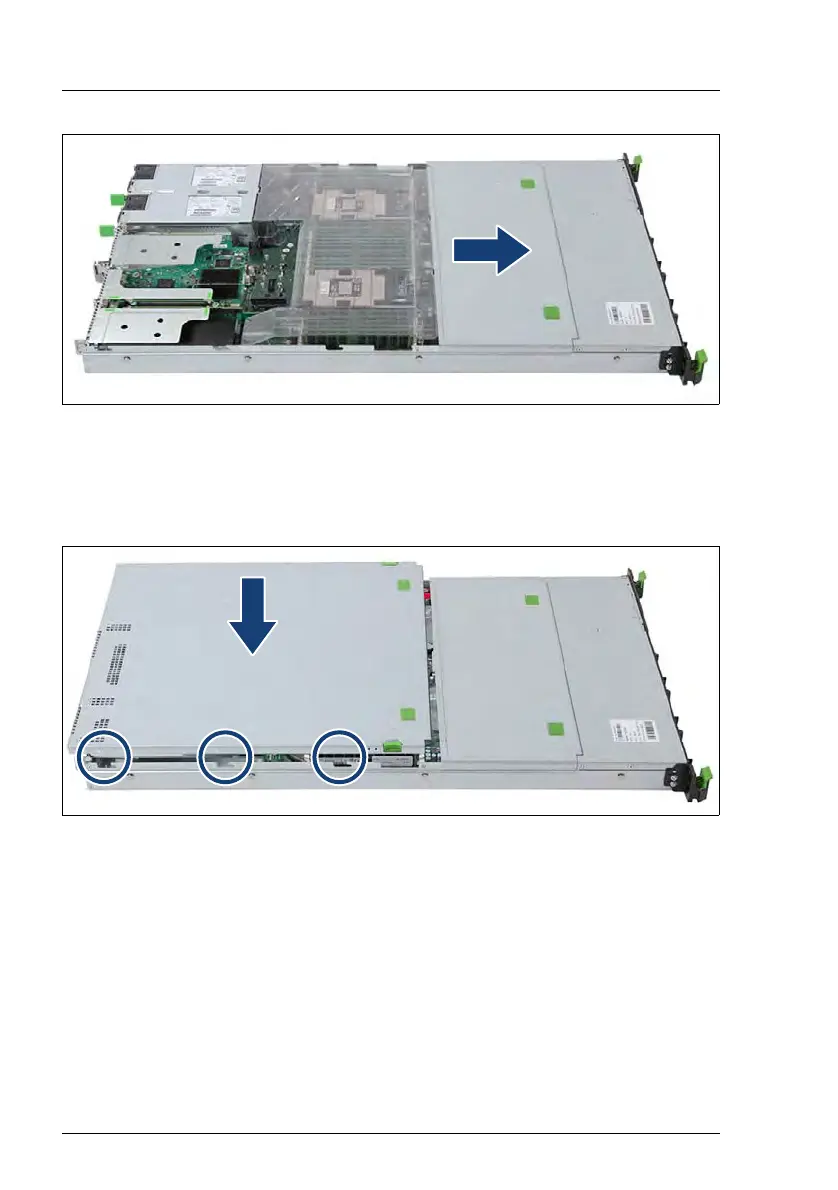 Ê Place the housing cover on the server. Notice the recesses (see circles).