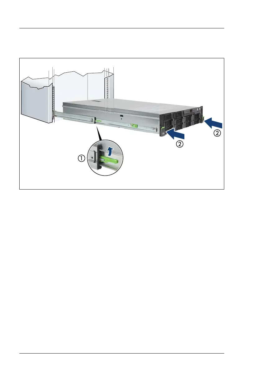 Ê Slide the server inside the rack as far as it will go (2) until the quick release