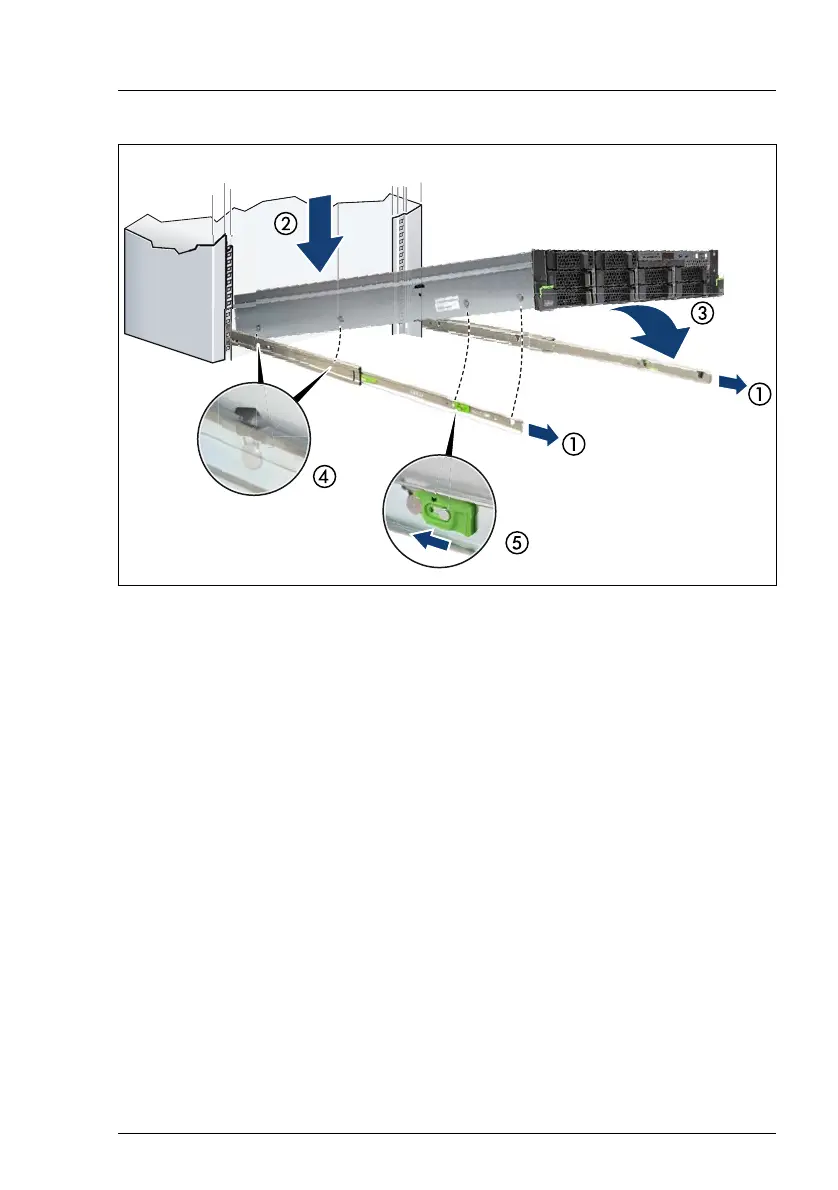 Ê Fold down the server, while pressing the rail to the server side (3). Ensure