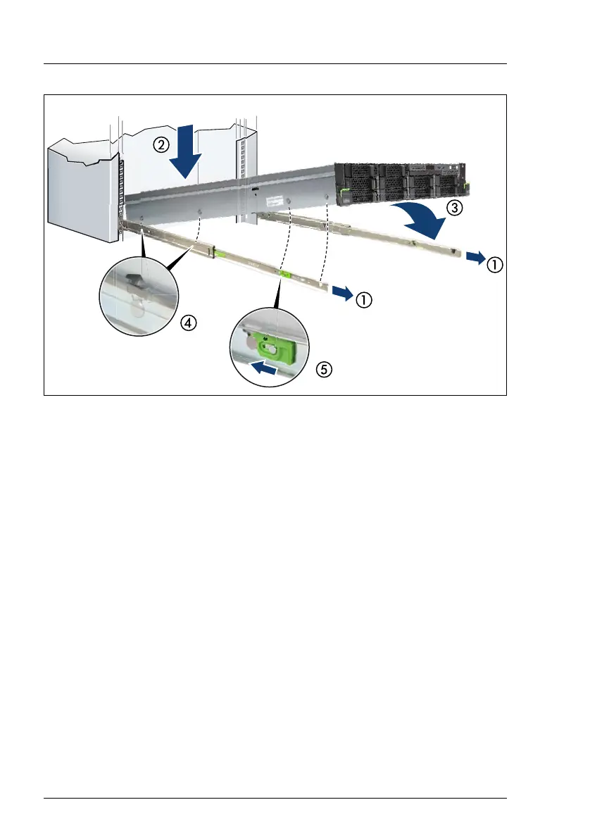 Ê Fold down the server, while pressing the rail to the server side (3). Ensure