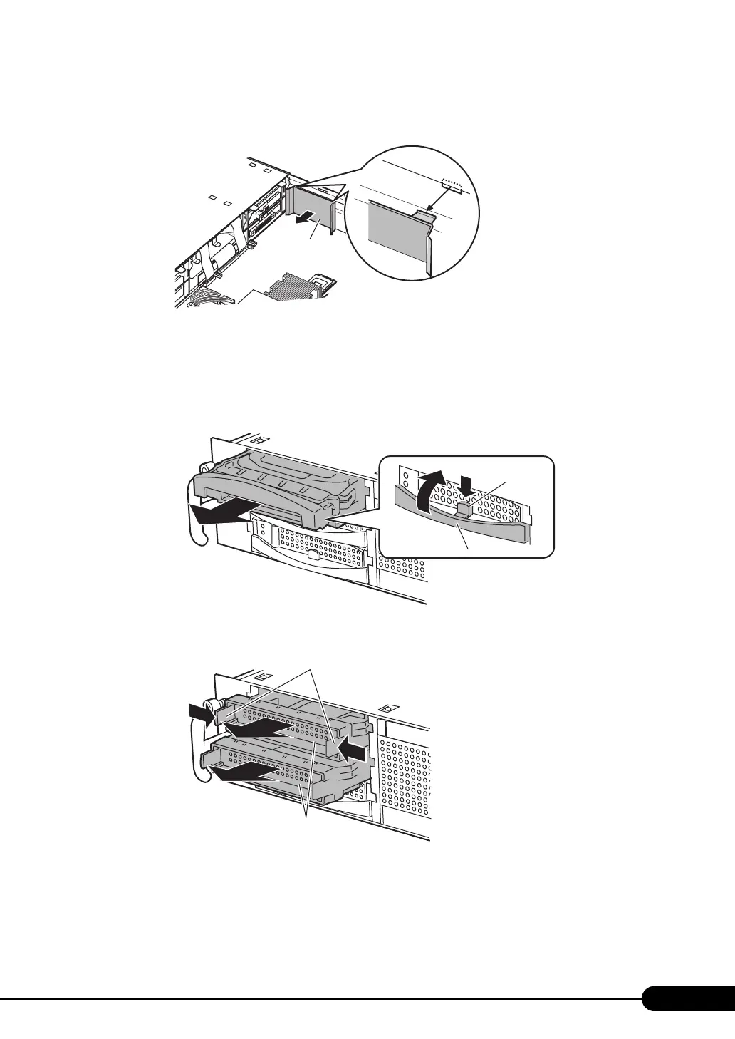 Lift up the handle while pressing the front tab of the internal hard disk unit down, and pull it.