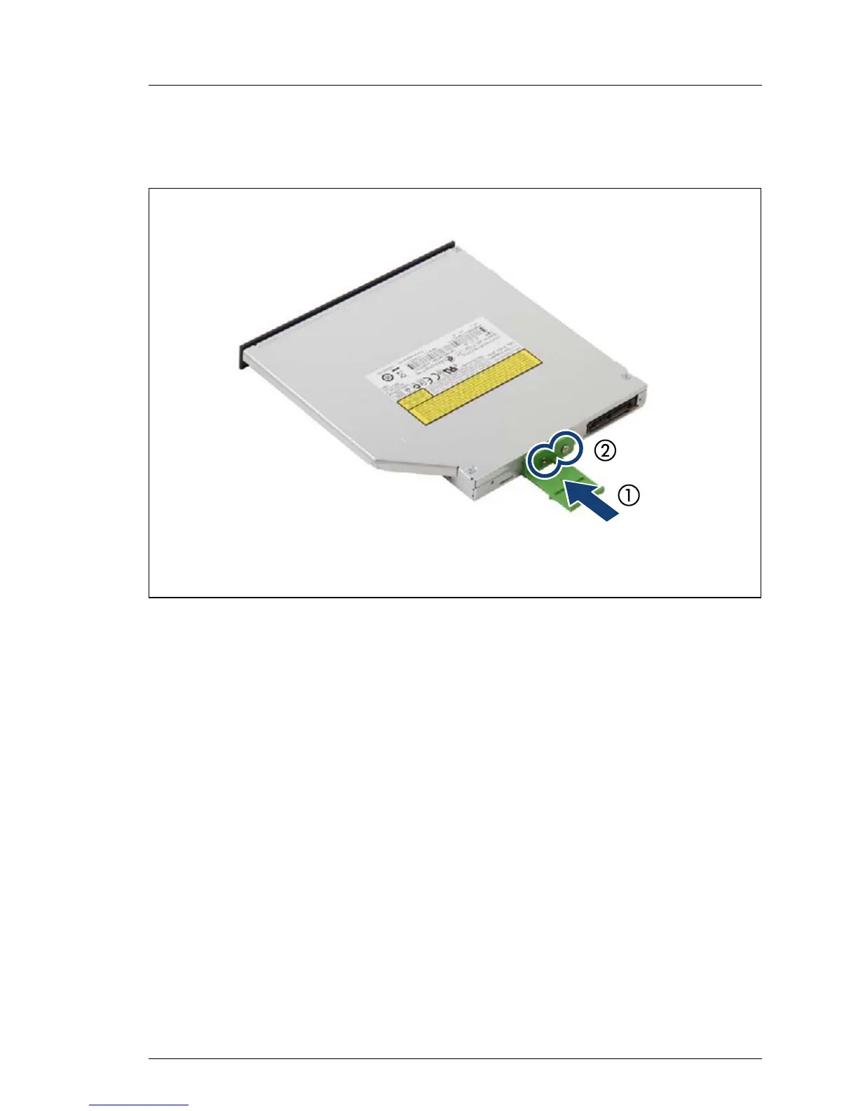 Ê Mount the ODD holder to the ODD (1) and secure it with two screws (2).