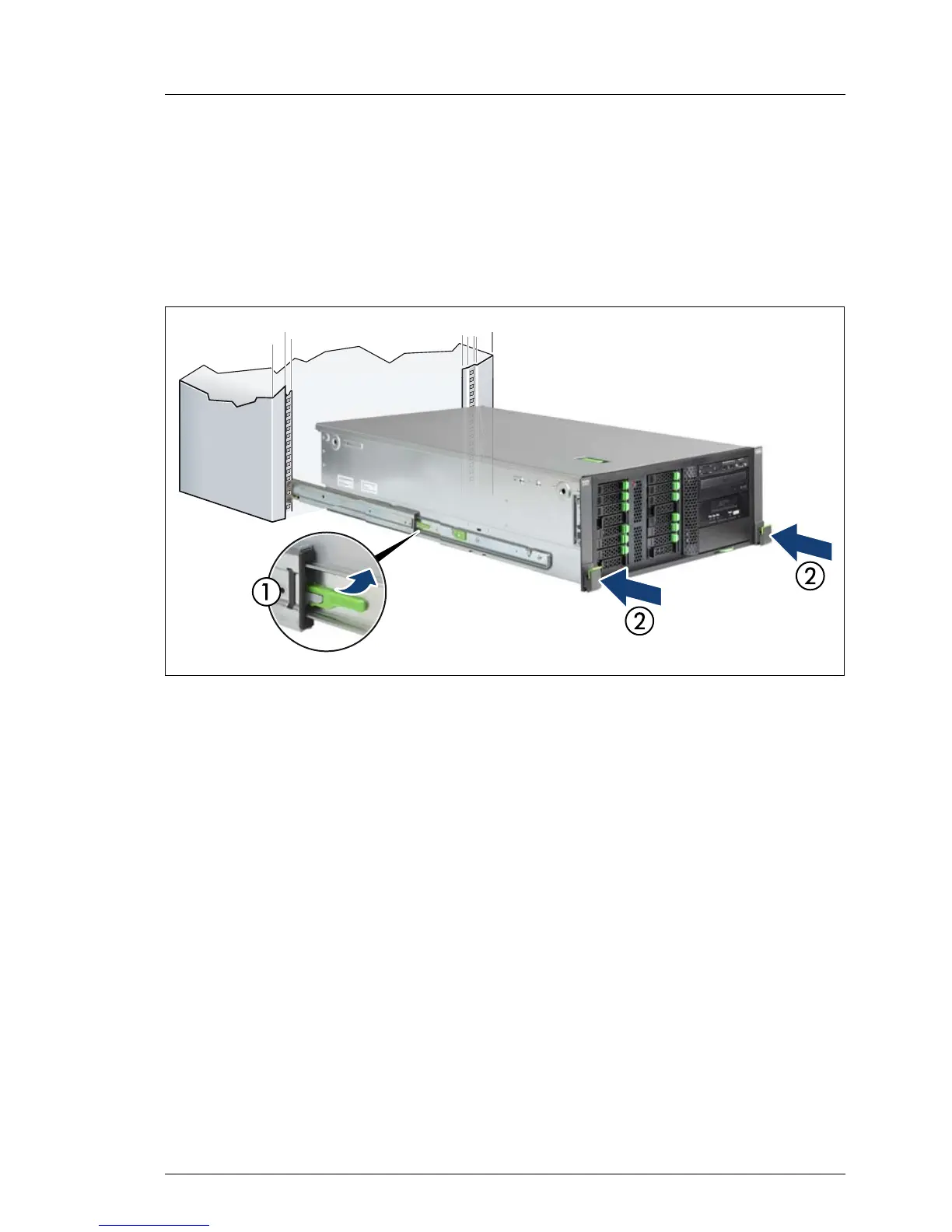 Ê Slide the server inside the rack as far as it will go (2) until the quick release