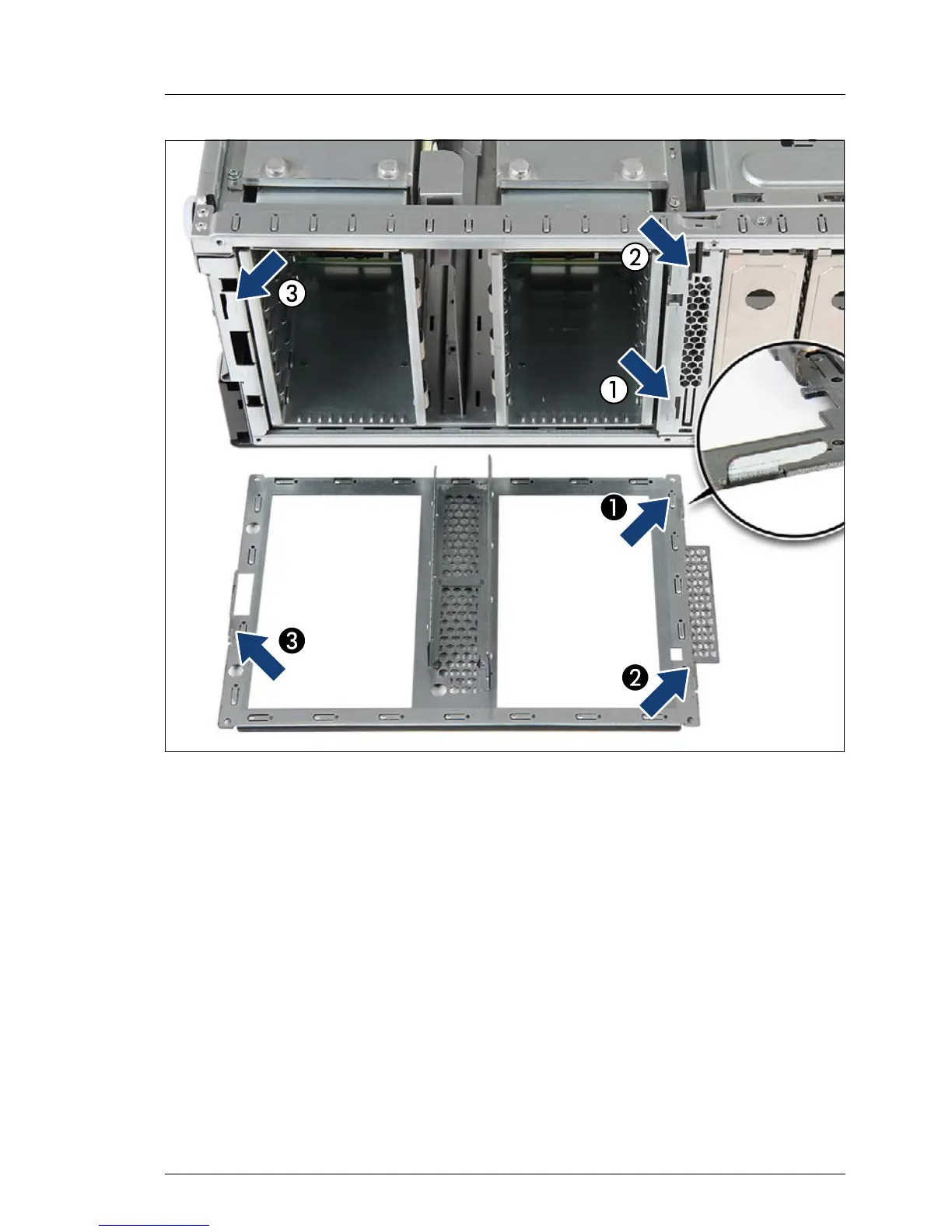 Ê Fit the three hooks on the HDD front panel into the slots in the server front.