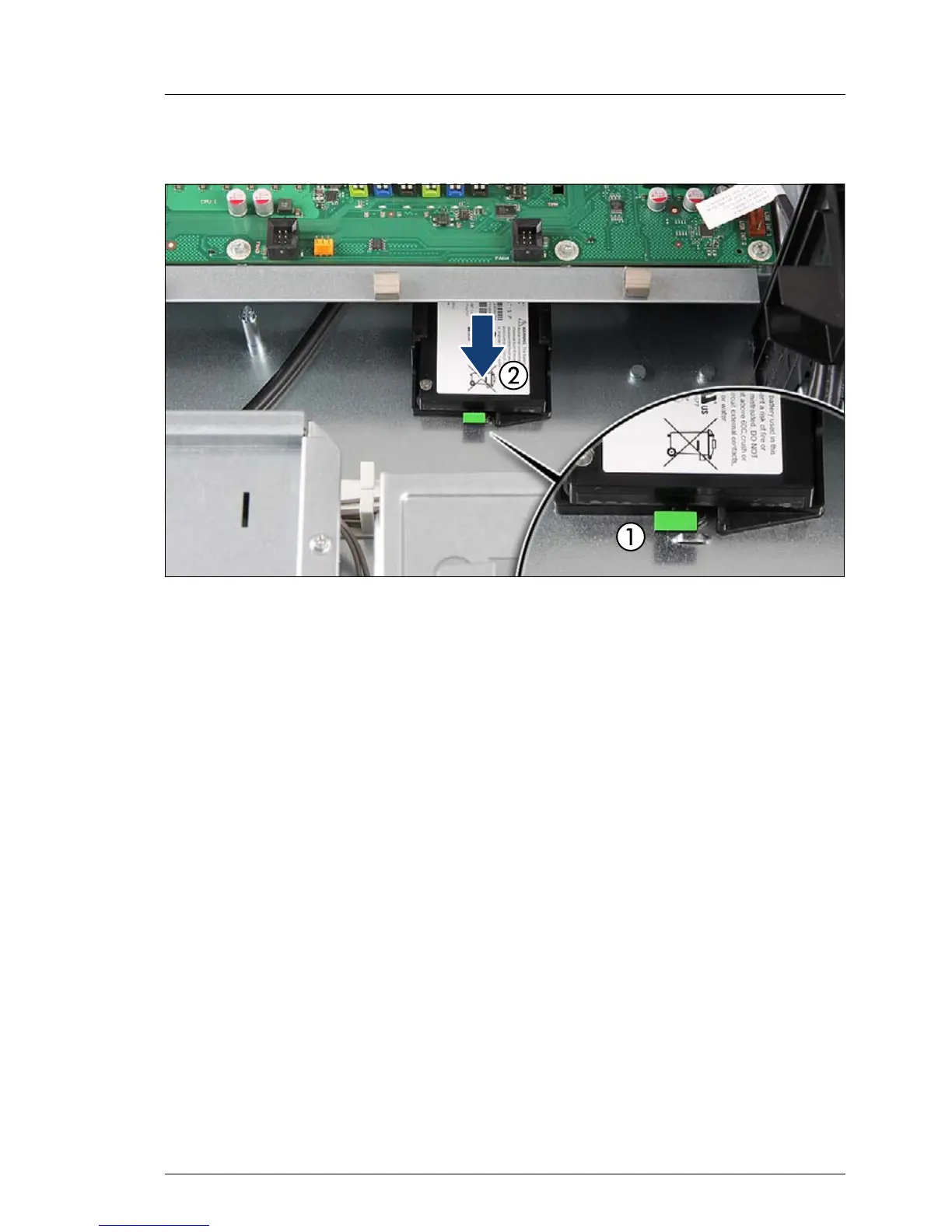 Ê Lift up the green locking handle on the BBU holder (1, see close-up) while