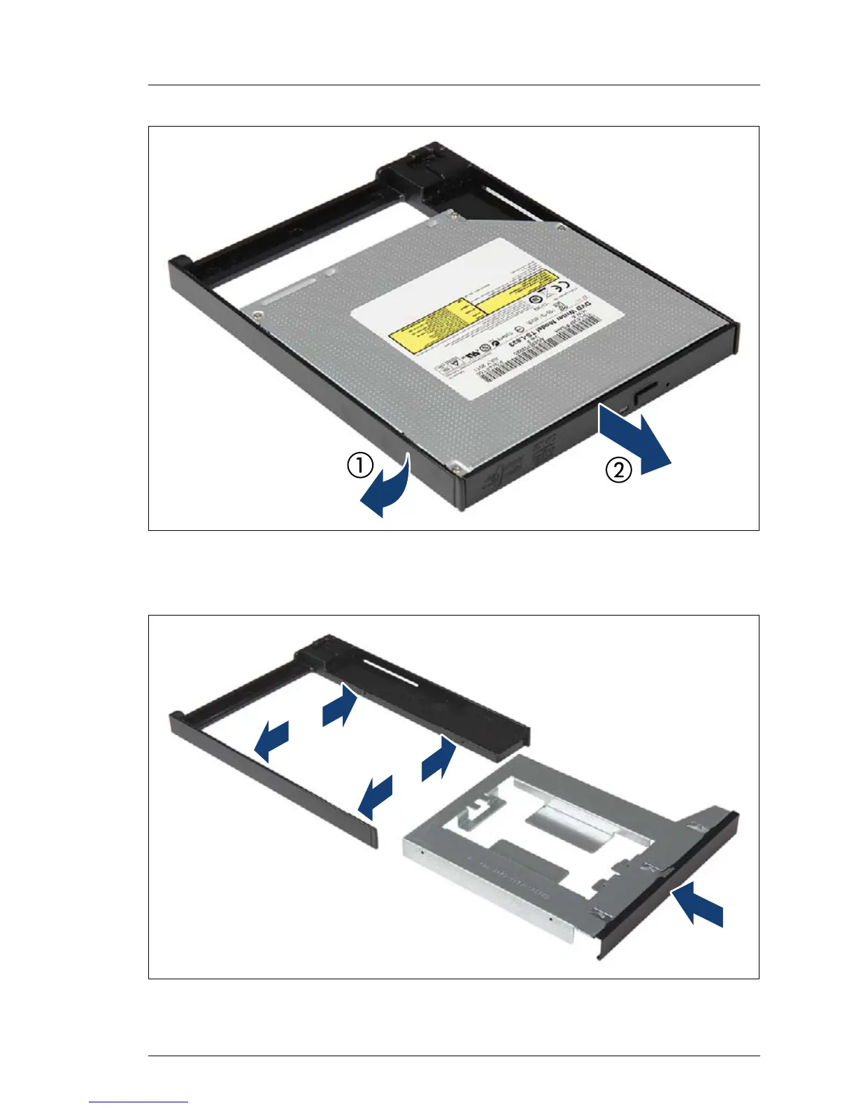 Ê Disengage (1) and remove (2) the slimline ODD from its installation frame.