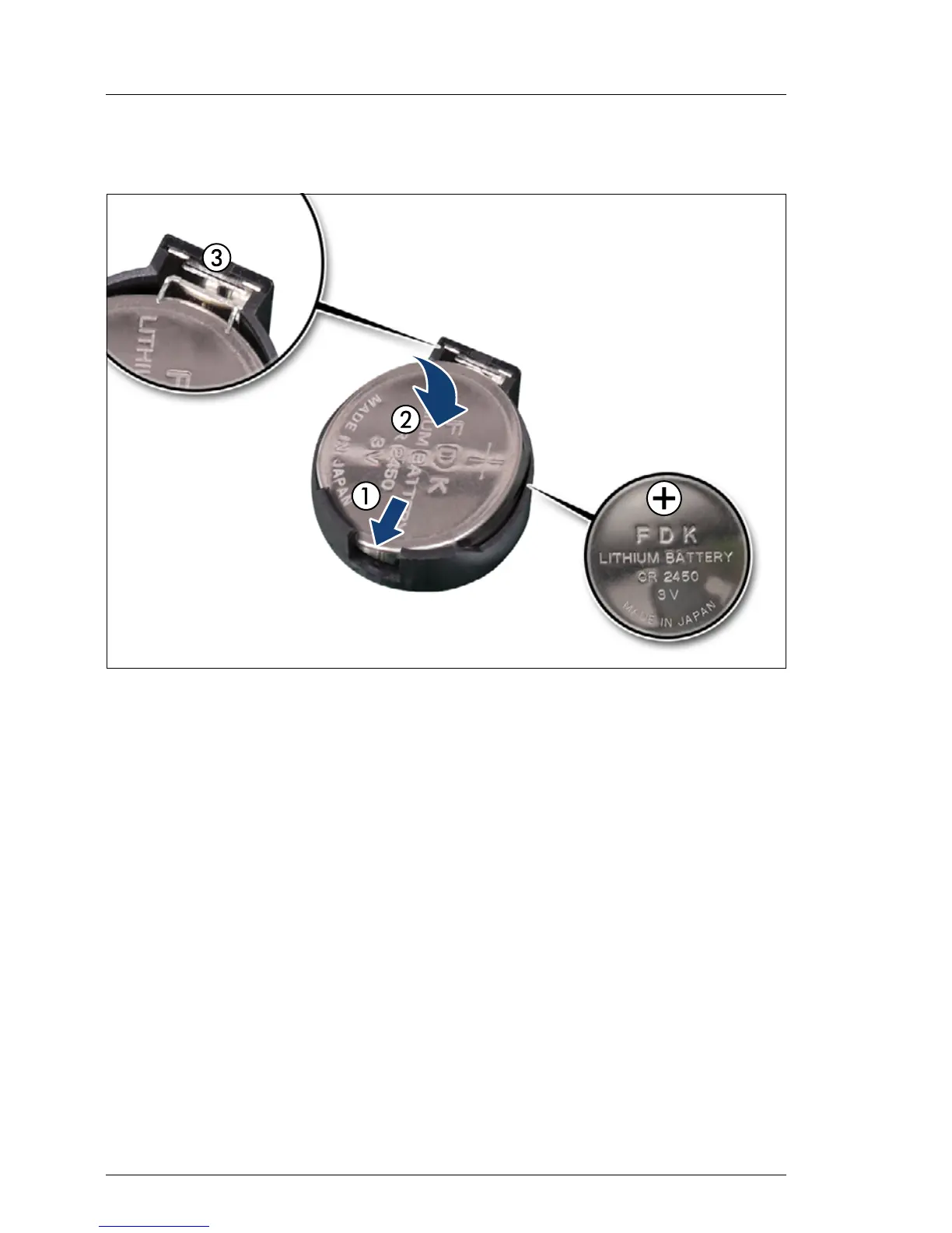 Ê At a slight angle, fit the new CMOS battery into its socket as shown (1).