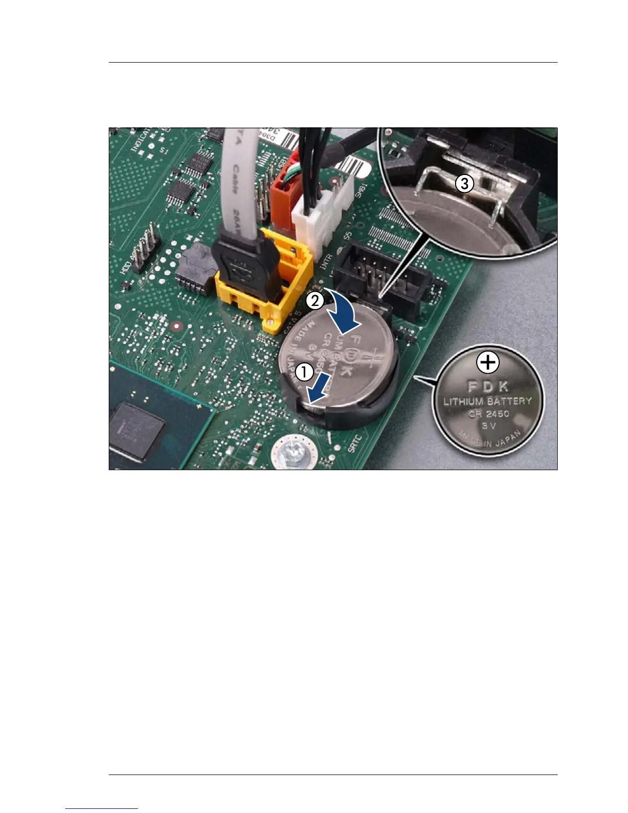 Ê Fold down the CMOS battery (2) until it locks in place.