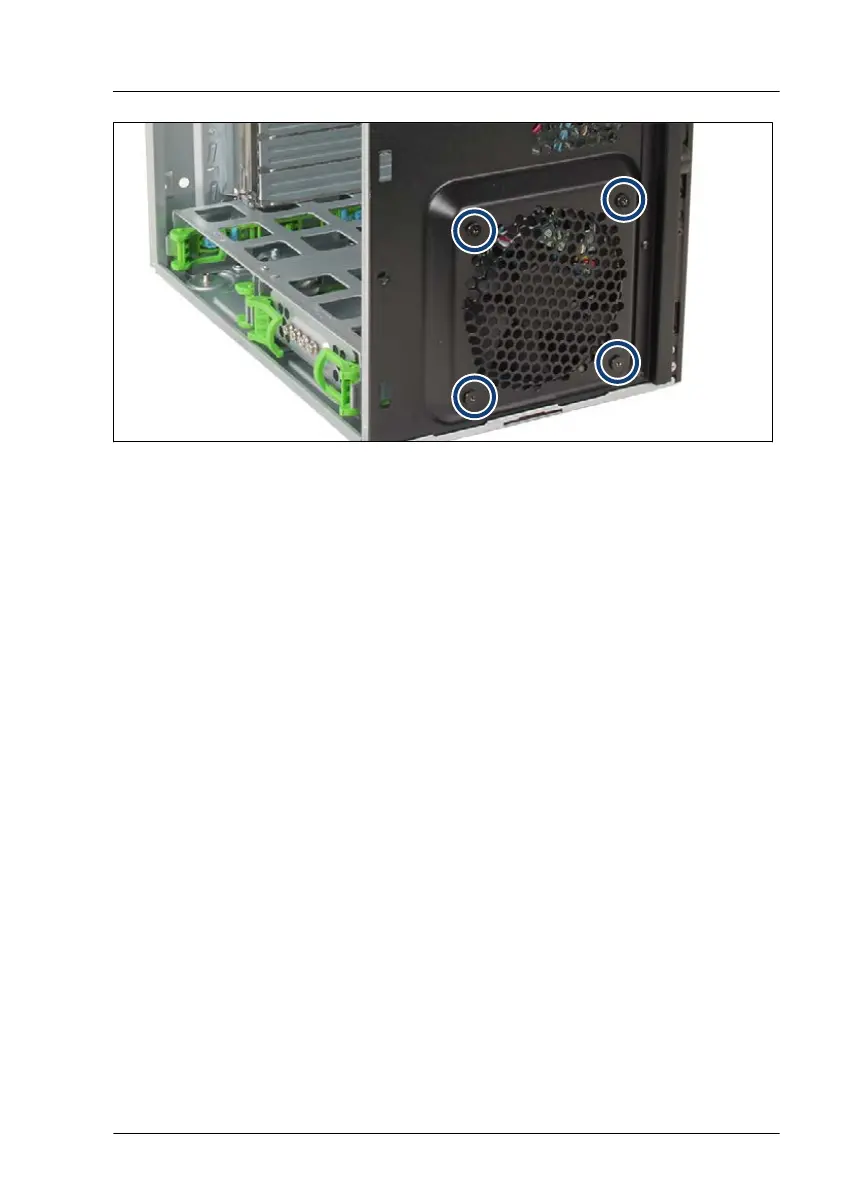 Fasten the four screws to the front fan (see circles). Screw torque: under