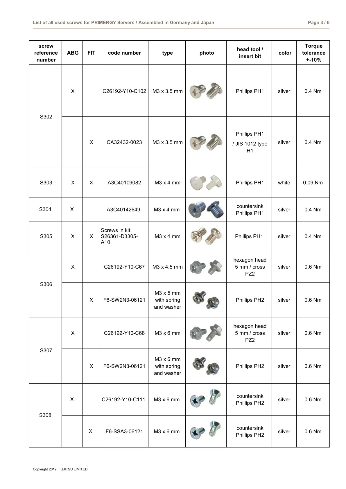 List of all used screws for PRIMERGY Servers / Assembled in Germany and Japan Page 3 / 6