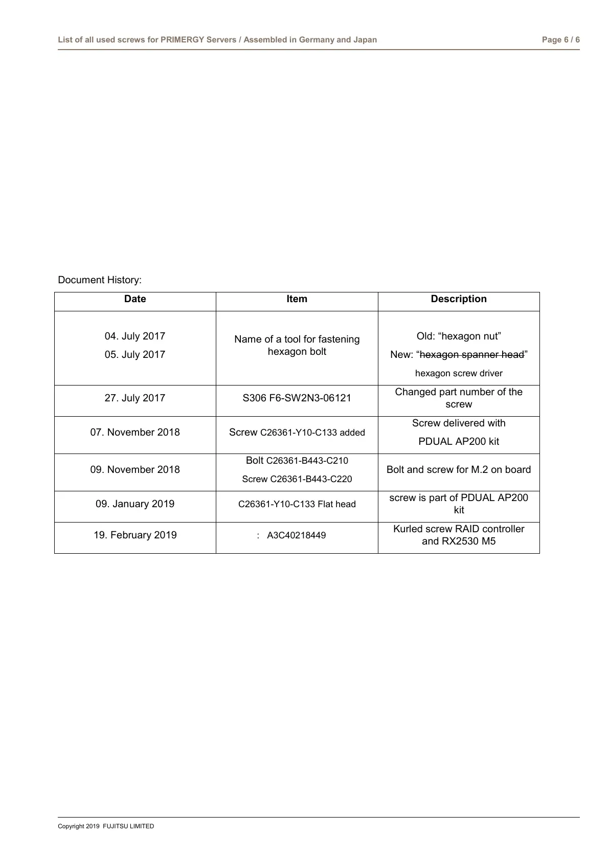 List of all used screws for PRIMERGY Servers / Assembled in Germany and Japan Page 6 / 6