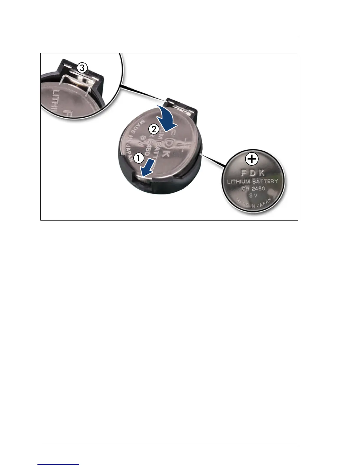 Ê Fold down the CMOS battery (2) until it locks in place.