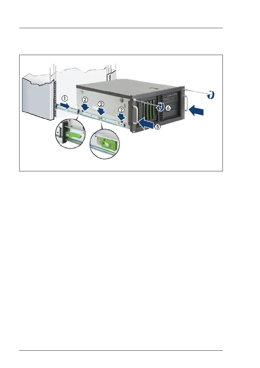 Ê Fasten the server to the rack (6) using the two knurled screws (front panel).