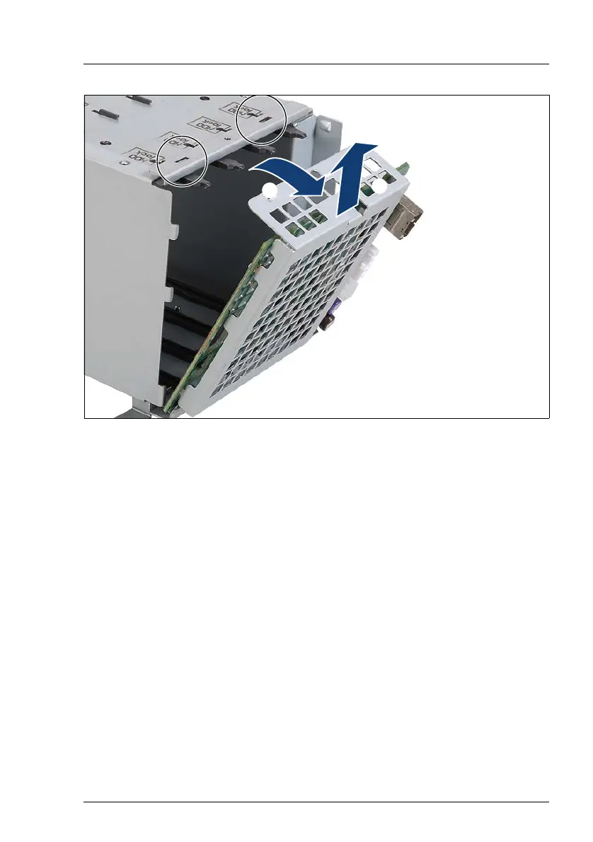HDD cage at a slight angle. Then lower the backplane holder. Metal tongues