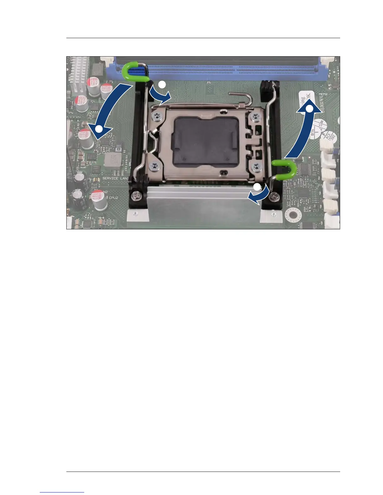 Ê Press the heat sink retaining clips downward and inward to release them (1).