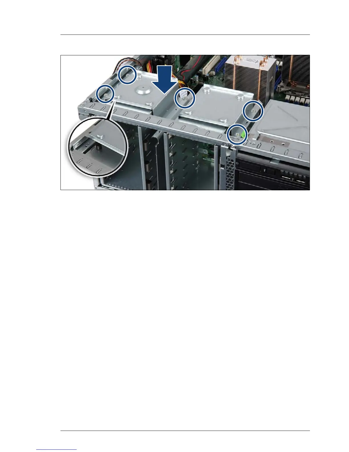 Ê Secure the HDD bay top cover to the chassis with five screws (see circles).