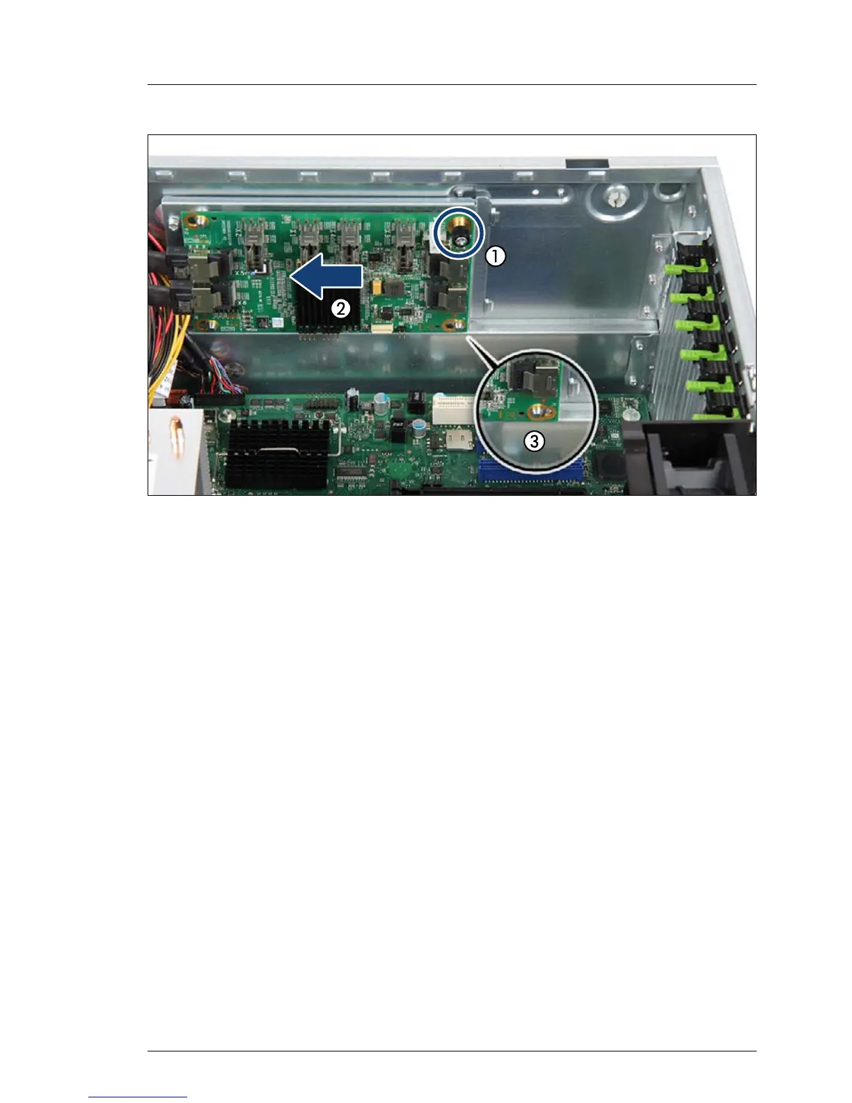 Ê Slide the SAS expander board to the left as far as it will go (2).