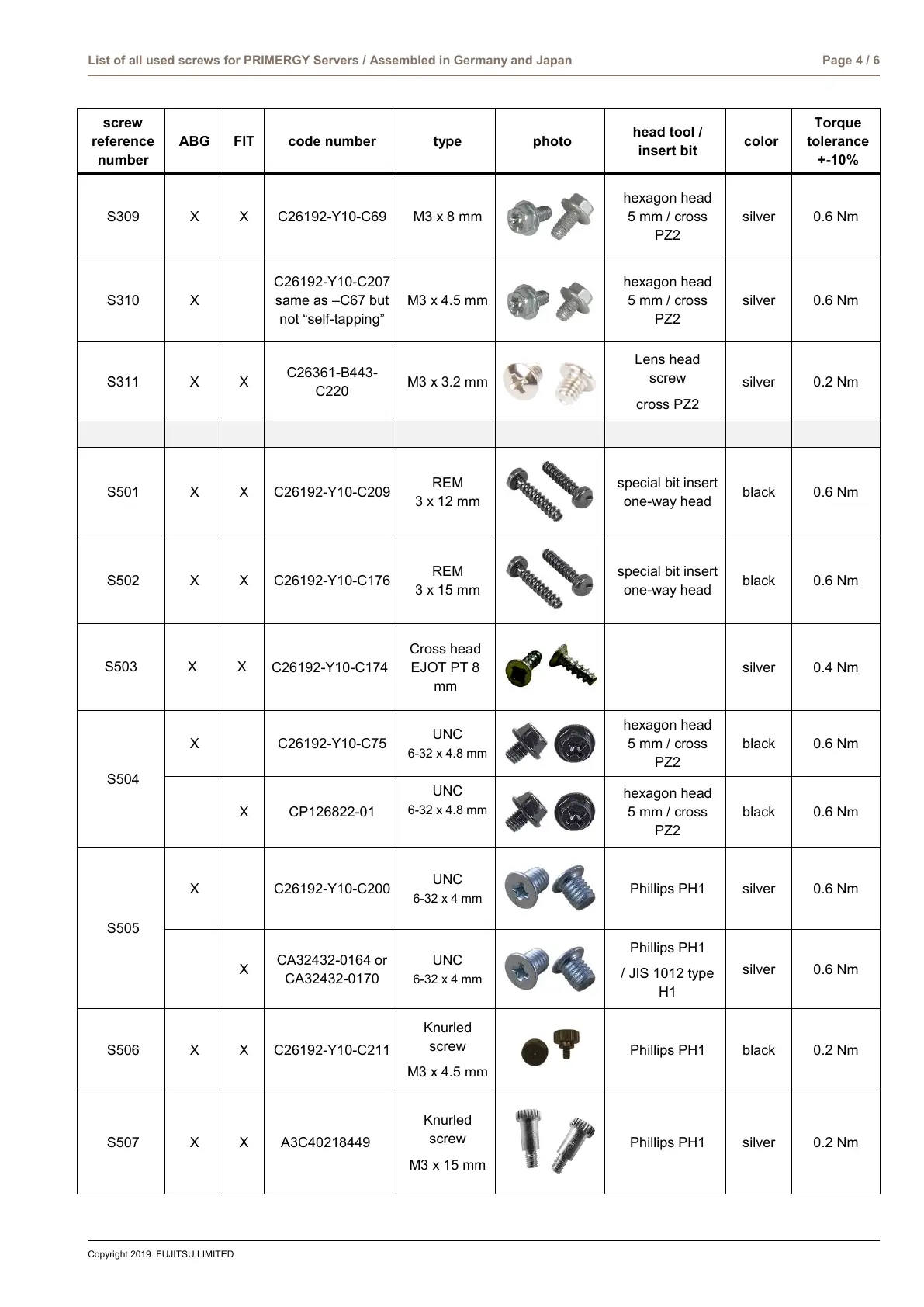 List of all used screws for PRIMERGY Servers / Assembled in Germany and Japan Page 4 / 6