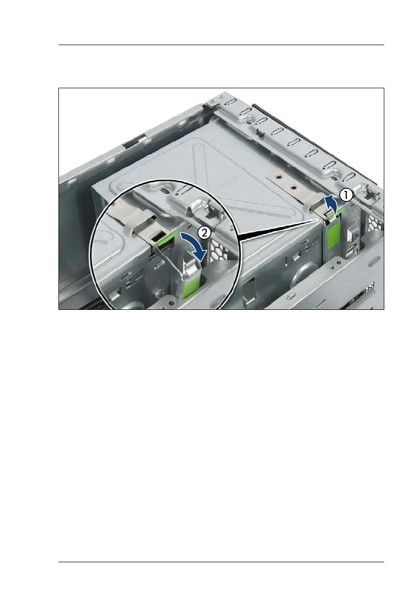 Pull up the locking latch to disengage the accessible drive locking bar (1).