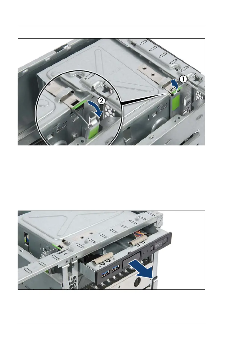 Pull up the locking latch to disengage the accessible drive locking bar (1).