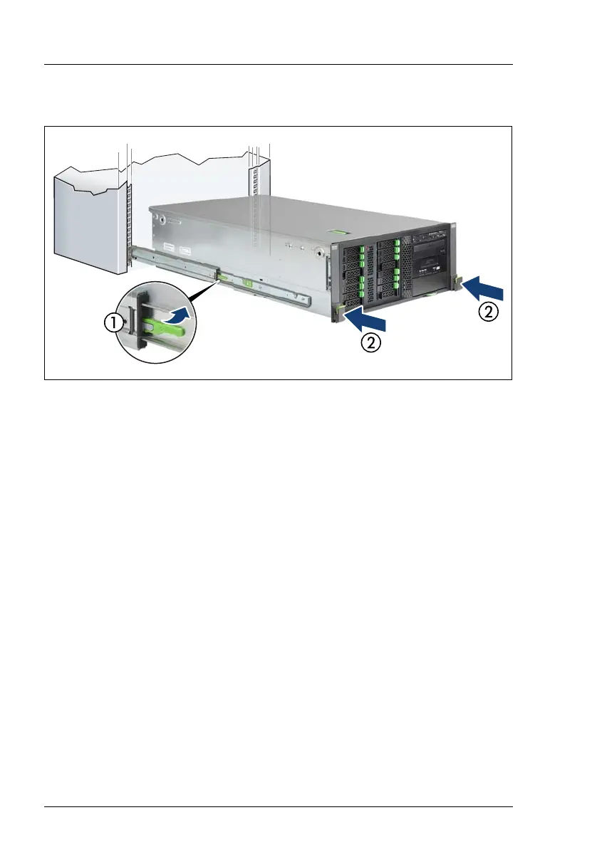 Slide the server inside the rack as far as it will go (2) until the quick release