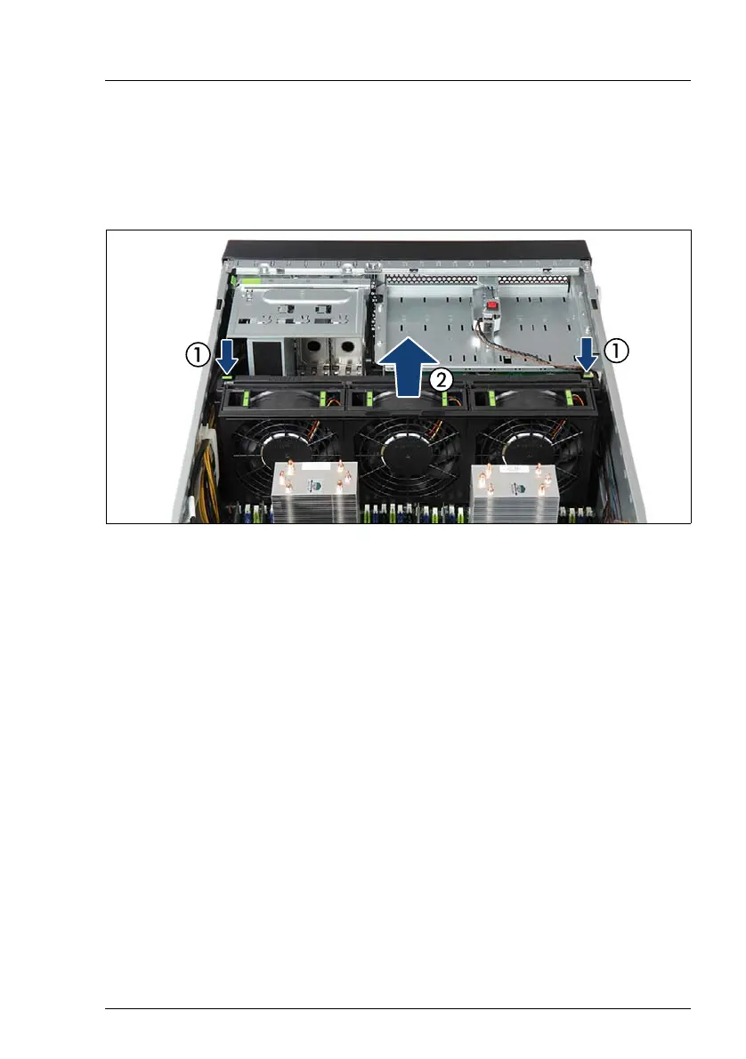 Press in on the two locking tabs (1) while slightly lifting up the system fan