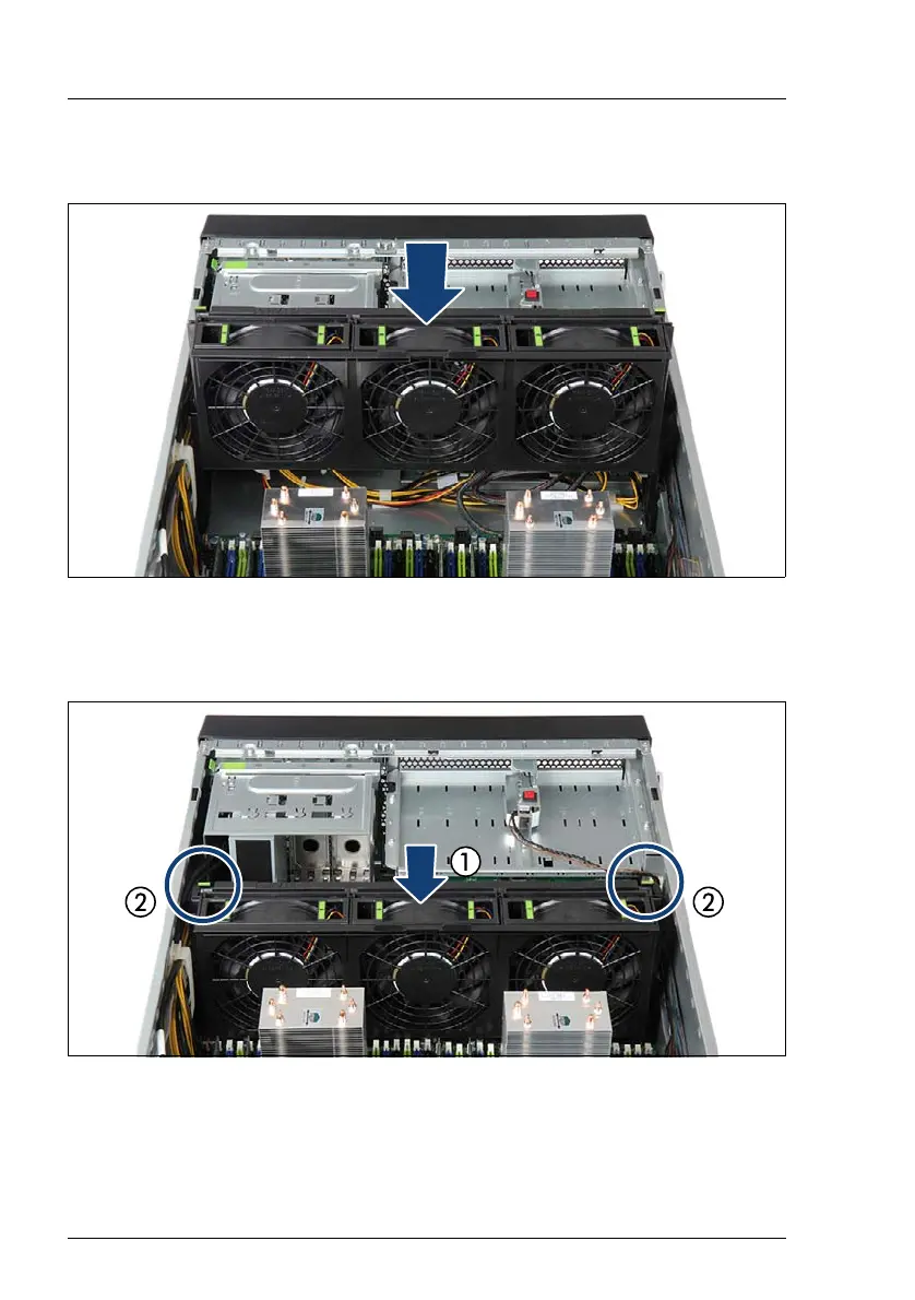 Carefully lower the fan holder into the chassis (1) until the two locking tabs