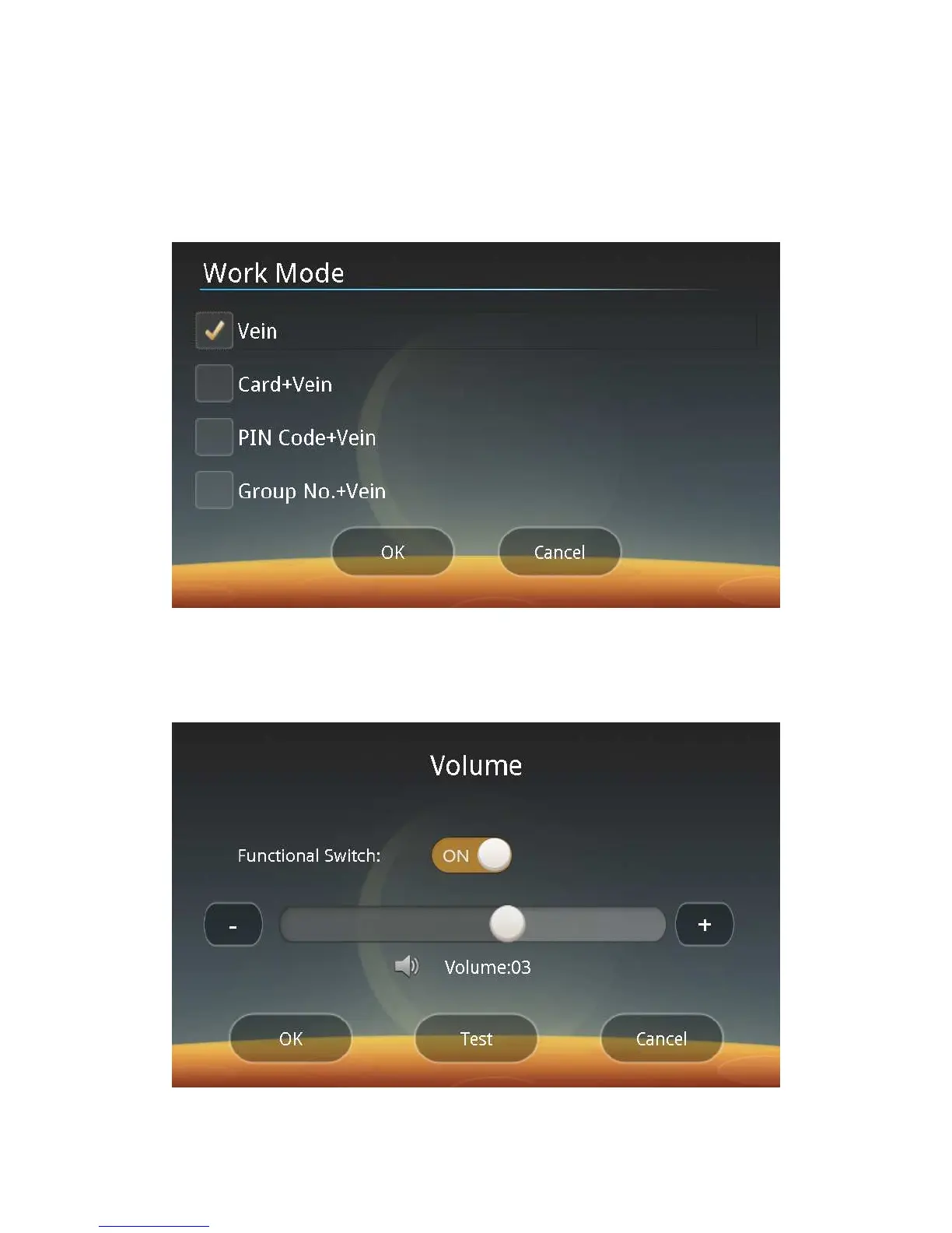 You can follow screen prompts to select the Palm Vein, Card + Palm Vein, PIN