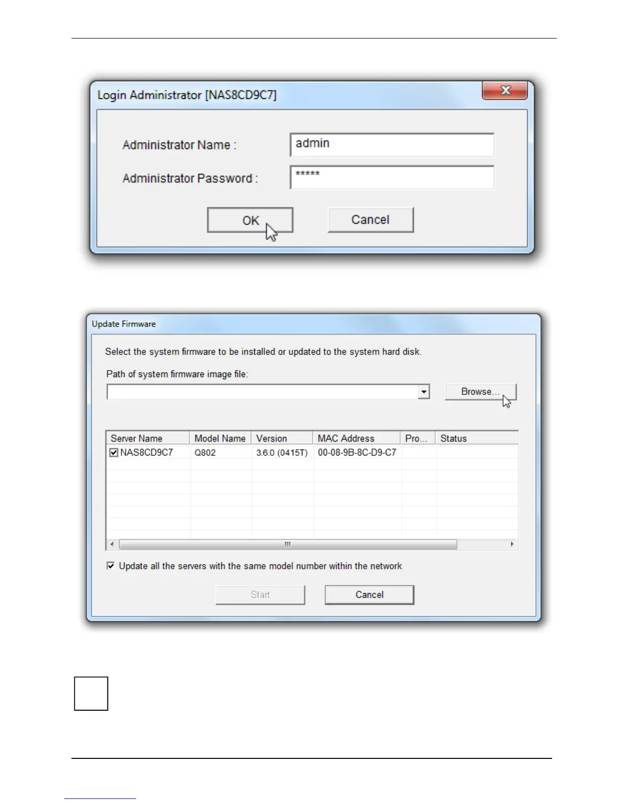 Browse to select the correct firmware for the NAS. Click Start to update the system.