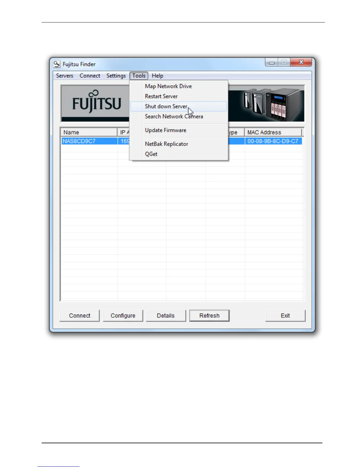 The Fujitsu Finder can be used to restart or shut down the server (admin access required).